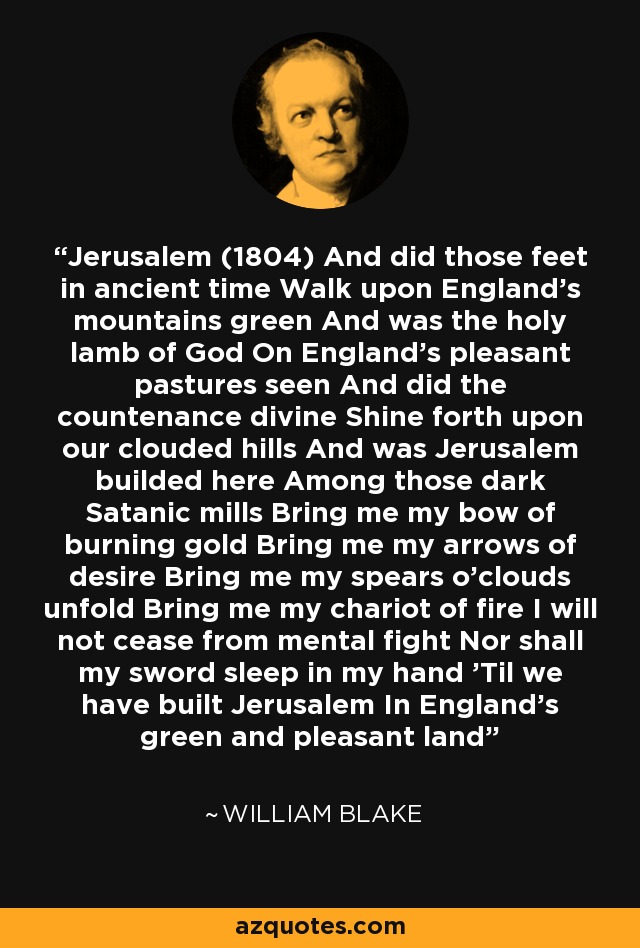 Jerusalem by William Blake aesthetique Etsy. Literary Works Similar to "Jerusalem" by William Blake Here you will find the Poem Jerusalem of poet William Blake